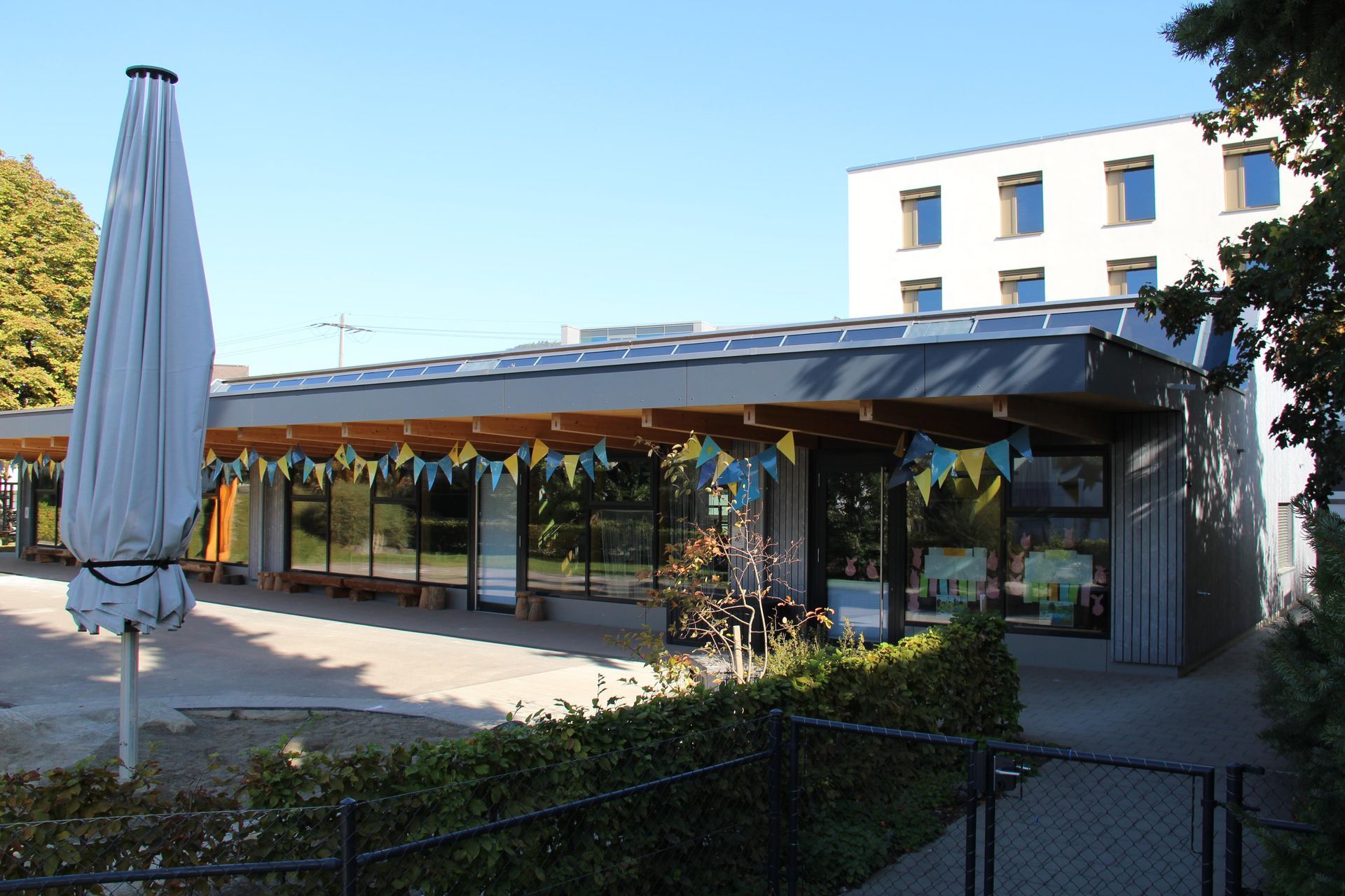 Holzbauweise, Holz-Metall-Fenster als Pfosten-Riegelsystem, Minergie mit Luft/Wasser-Wärmepumpe, Komfortlüftung