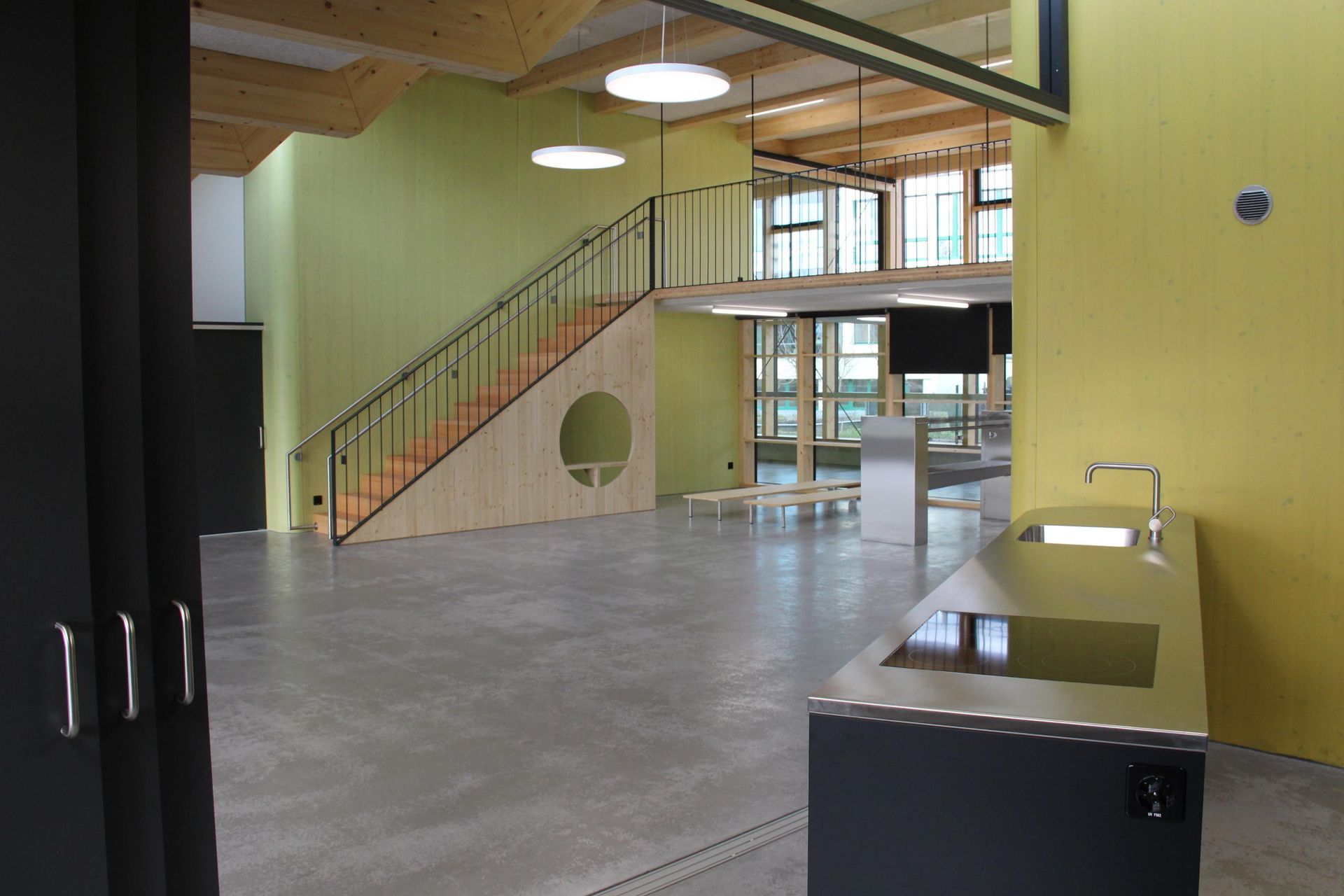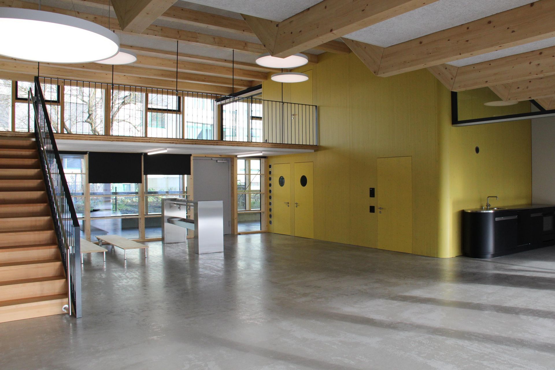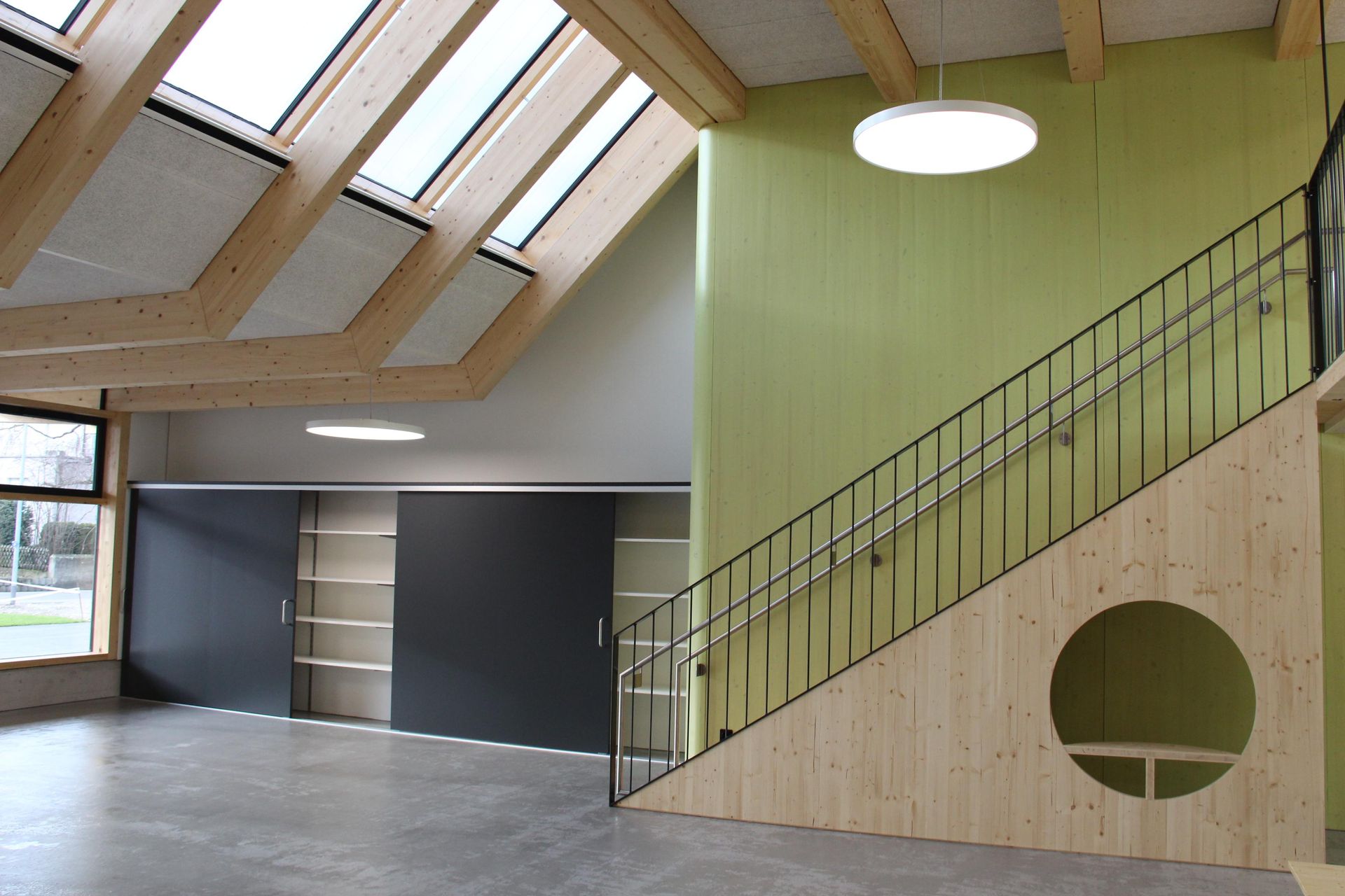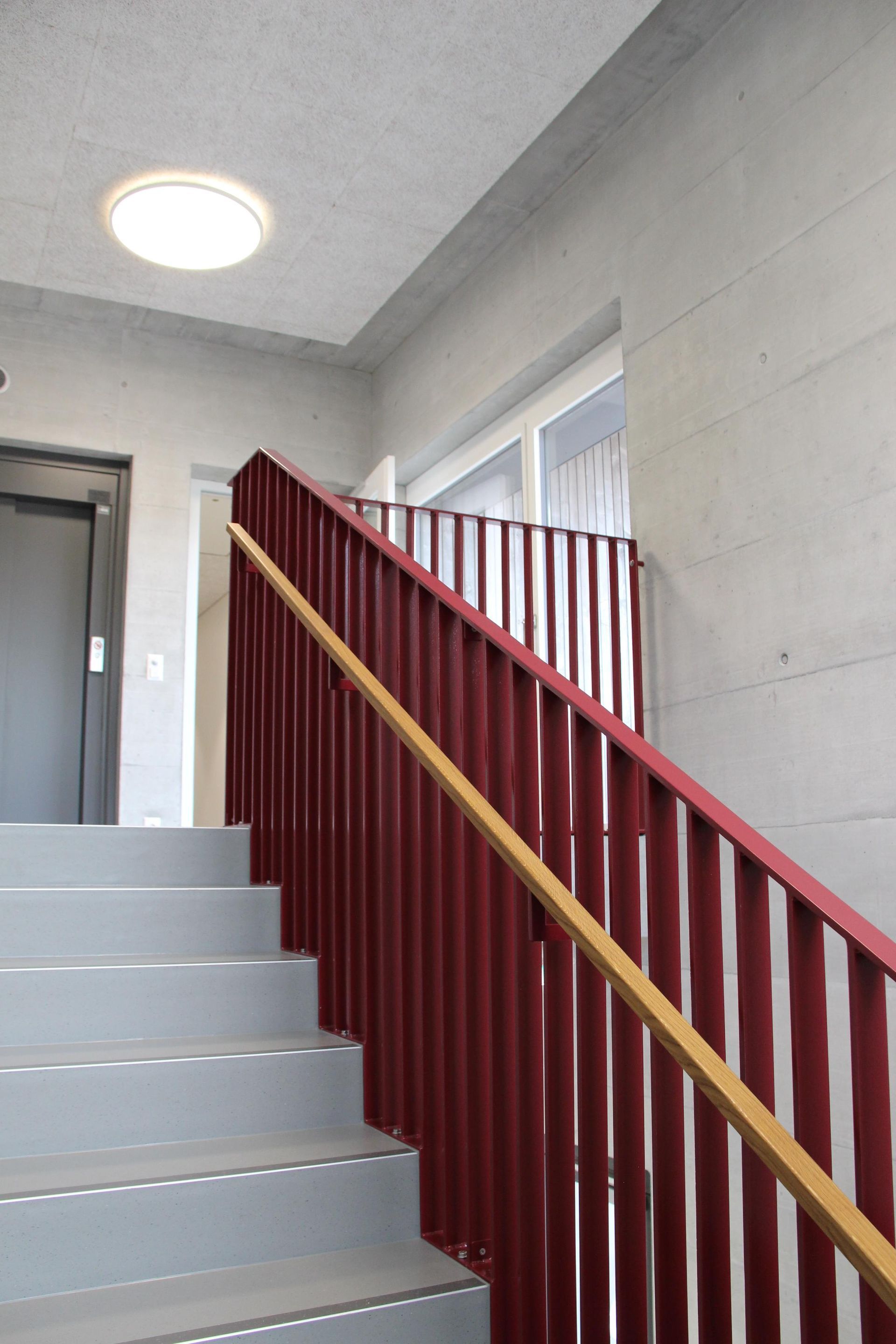 Holzbauweise, Treppenhaus in Sichtbeton, Holz-Metall-Fenster, Minergie mit Erdsonden-Wärmepumpe, Komfortlüftung
